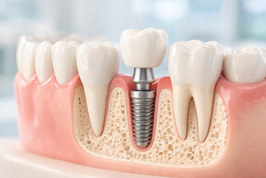 インプラントは、顎の骨に埋め込まれた人工歯根と、その上に装着される人工歯で構成されています。
