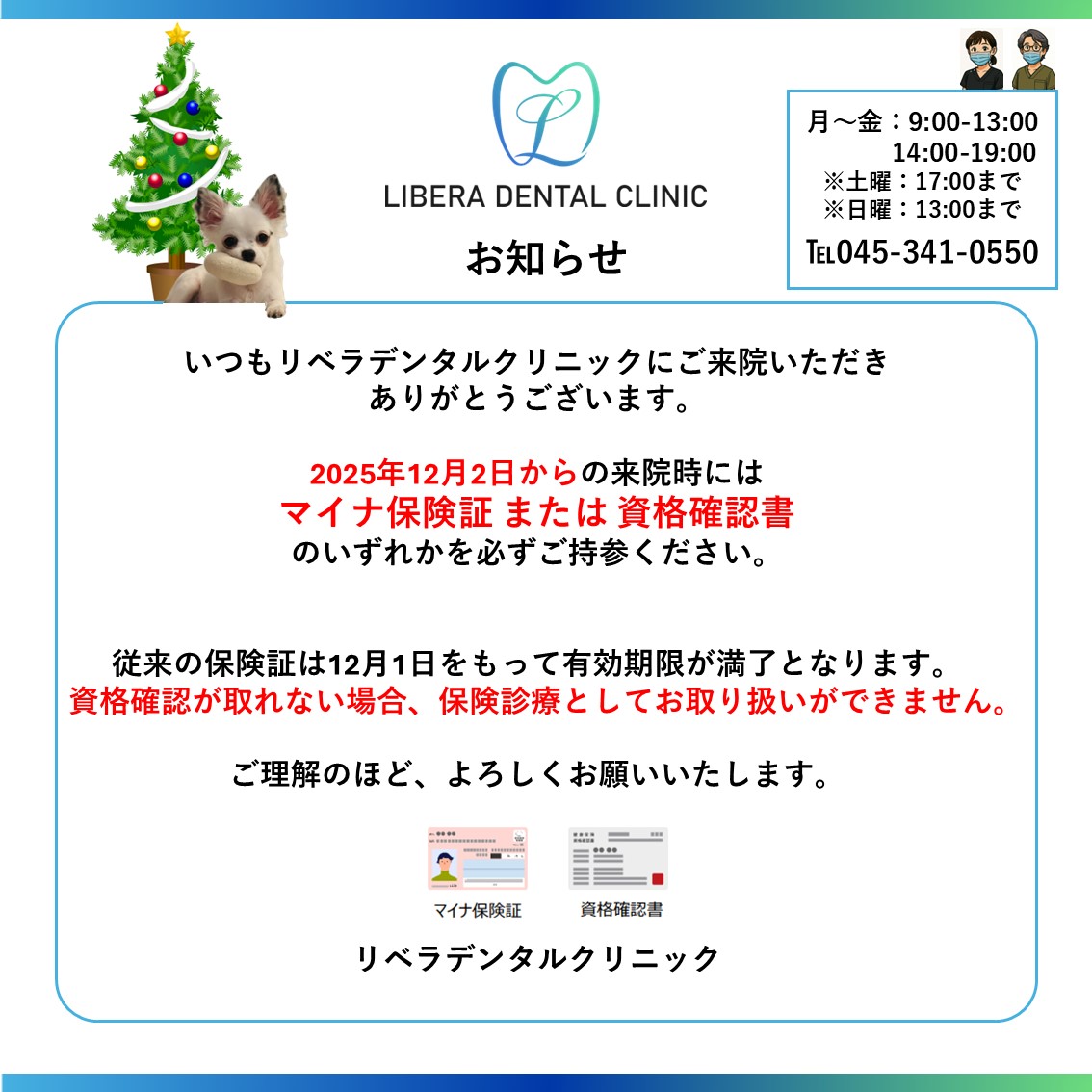 12月2日以降の来院からは、マイナ保険証もしくは資格確認書、医療証を必ずご持参いただくようにお願いします。